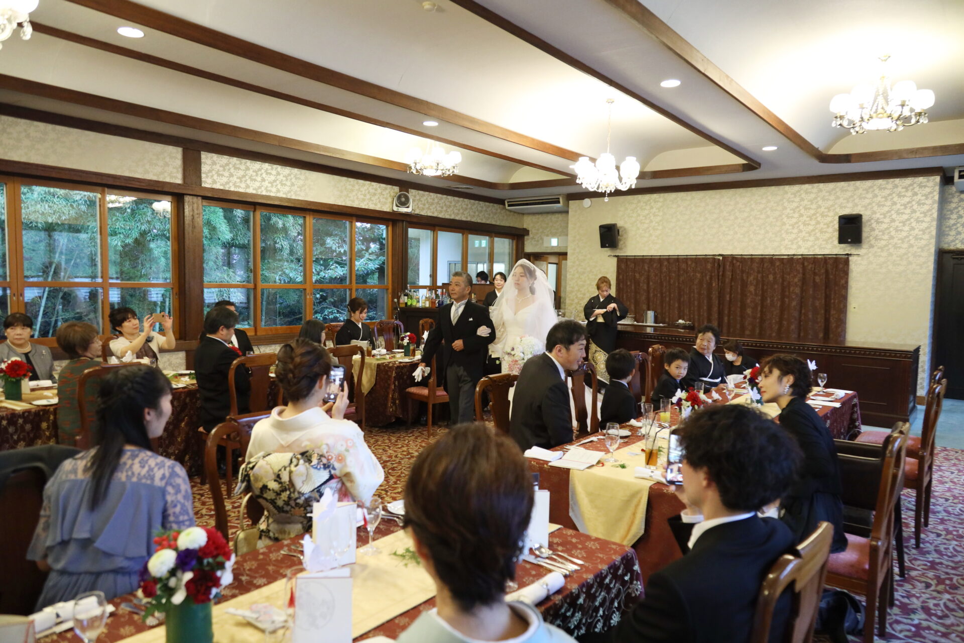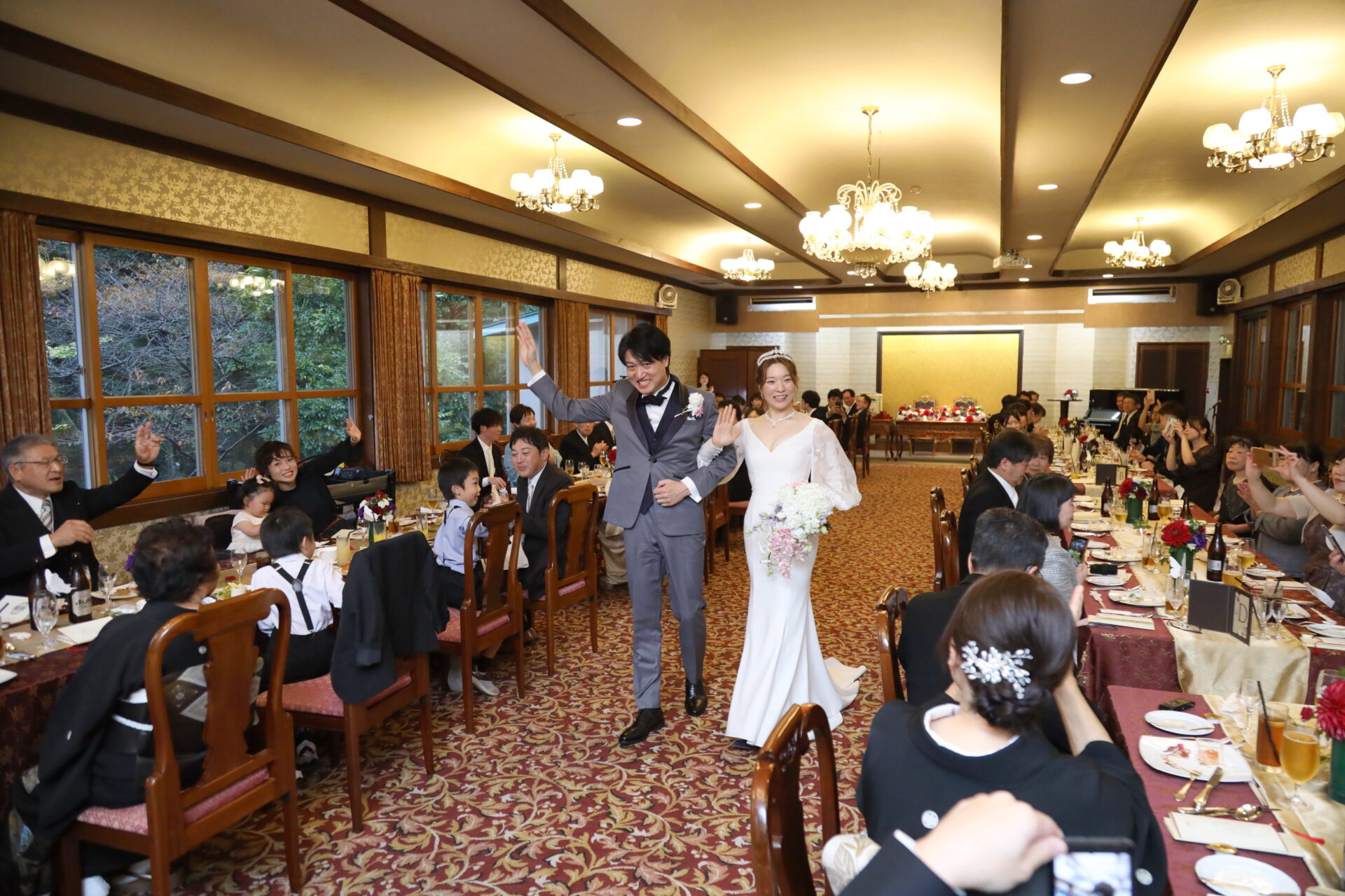 人前式での入場の瞬間は、私たちにとって何よりも印象深いものでした。ゲストの皆さまと初めて対面したその瞬間、涙を流して迎えてくださる方も多く、その光景を目にしたときには胸が熱くなり、思わず私たち自身も涙がこみ上げてきました。あの場に集まってくださった皆さんの笑顔や温かい拍手、そして祝福の言葉が、私たちの心に深く刻まれました。