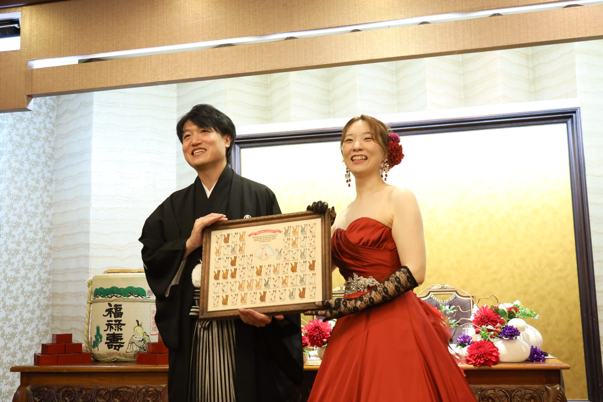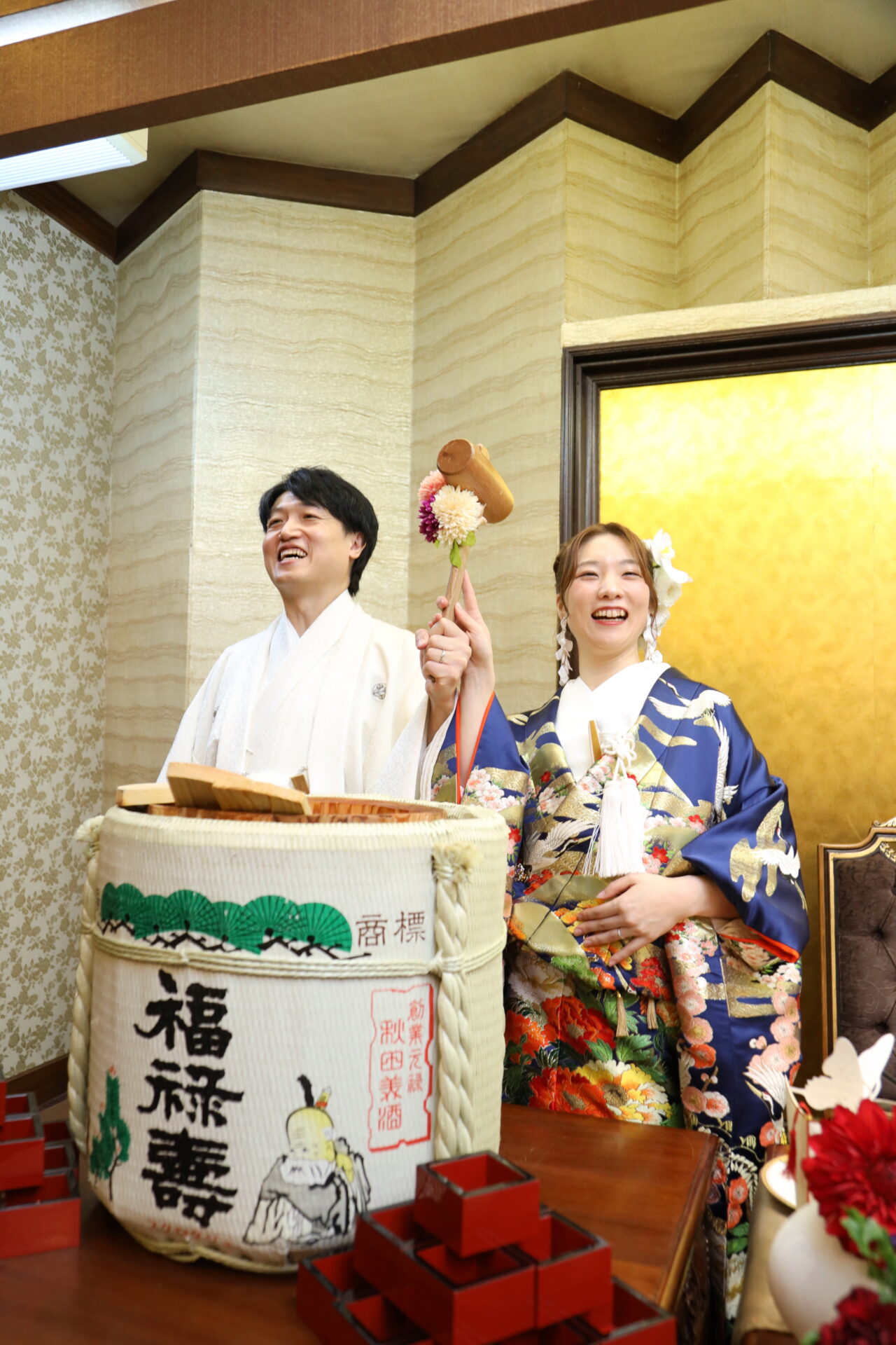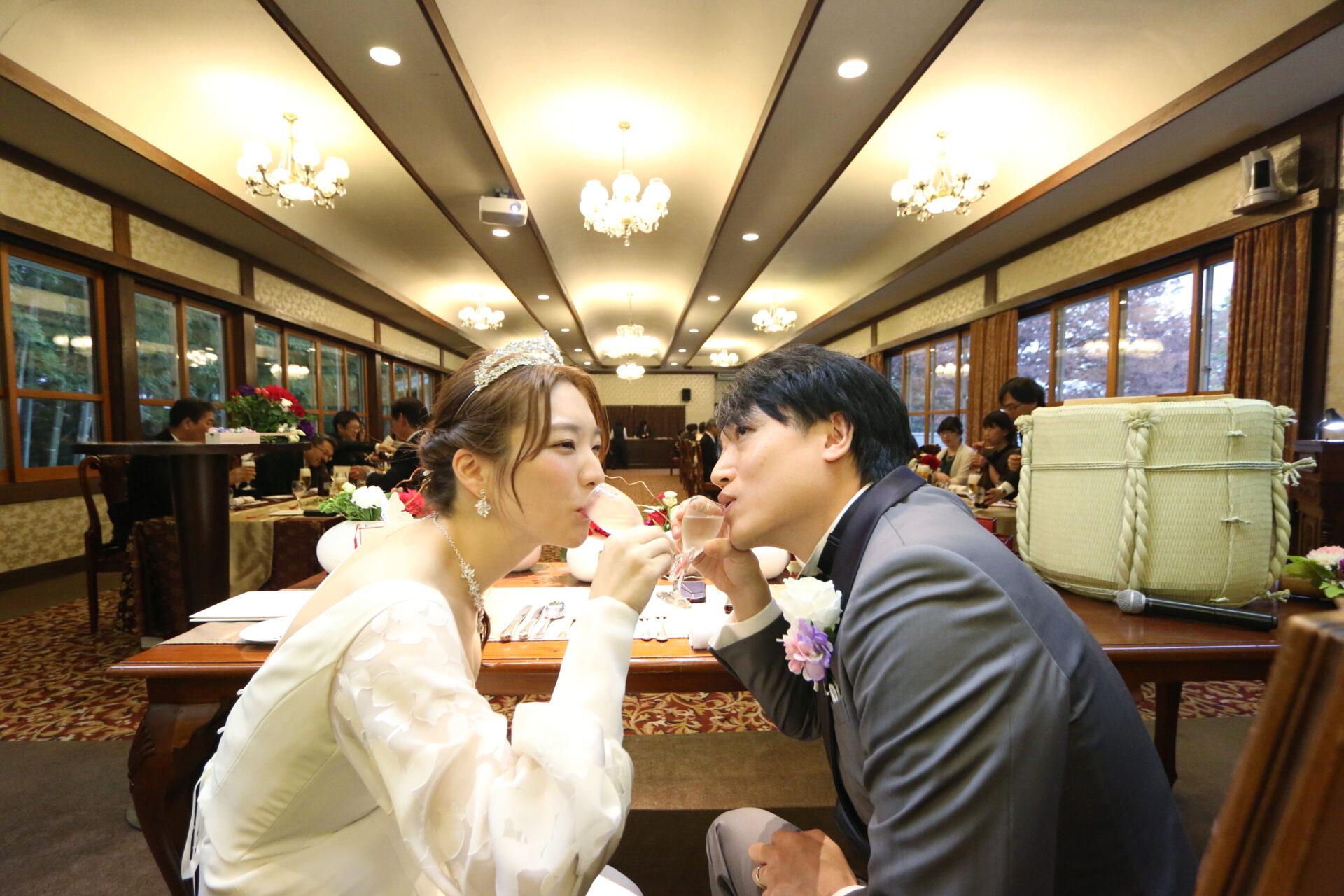 また、披露宴の鏡開きのシーンも特に心に残っています。大勢のゲストと一緒に祝い酒を酌み交わしながら、当初からのテーマであった「大きな飲み会のような披露宴」を実現できた瞬間は、本当に嬉しくて、会場全体が笑顔と歓声でひとつになっているのを感じることができました。ゲストの皆さんと一緒に楽しむ時間の一つひとつが、私たちにとってかけがえのない思い出となりました。
