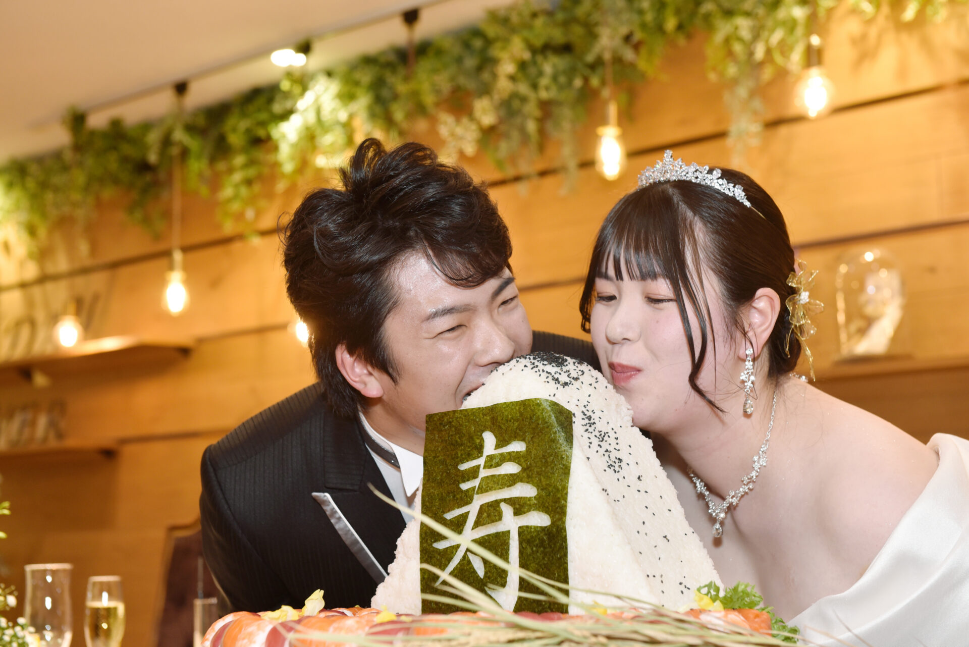 【おにぎりセレモニー】では、大好きなおにぎりをテーマにしたユニークな演出を行いました。大きなおにぎりが音楽に合わせて運ばれると会場から笑いが起こり、ごま塩を振って「寿」の海苔を貼り、二人で頬張る流れに皆様も大盛り上がり。私たち自身もとても楽しく、そしておにぎりも本当に美味しかったです🍙