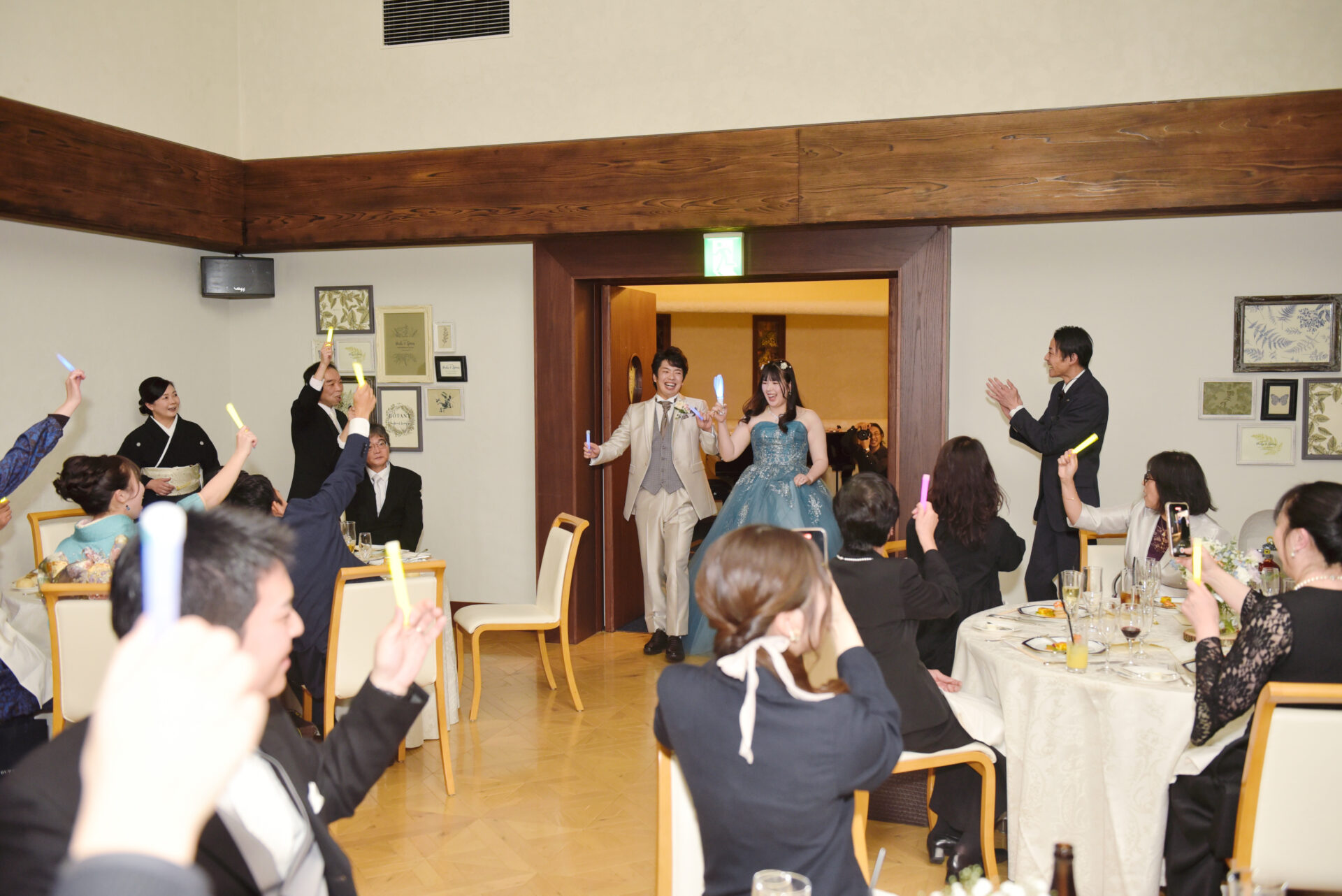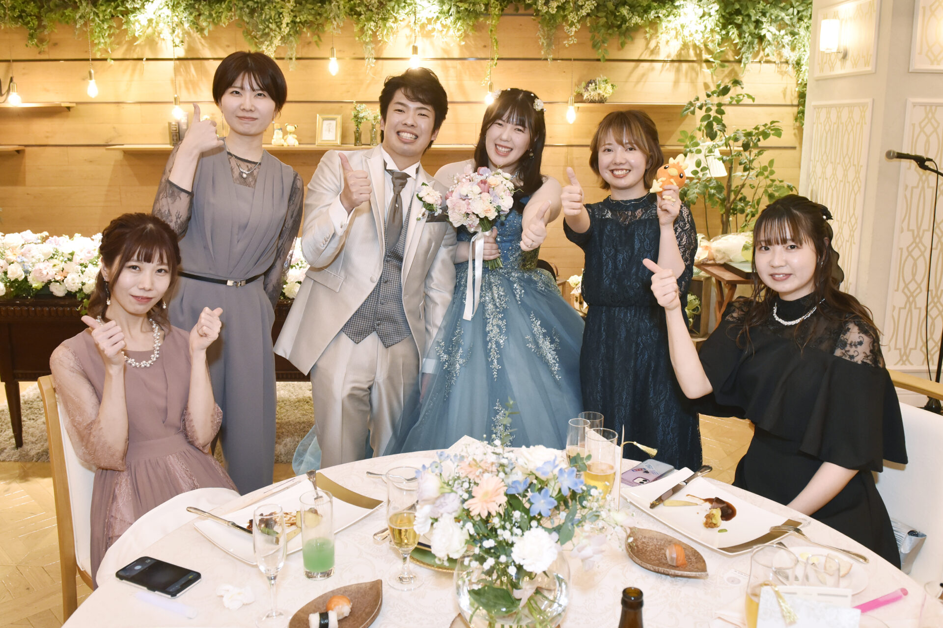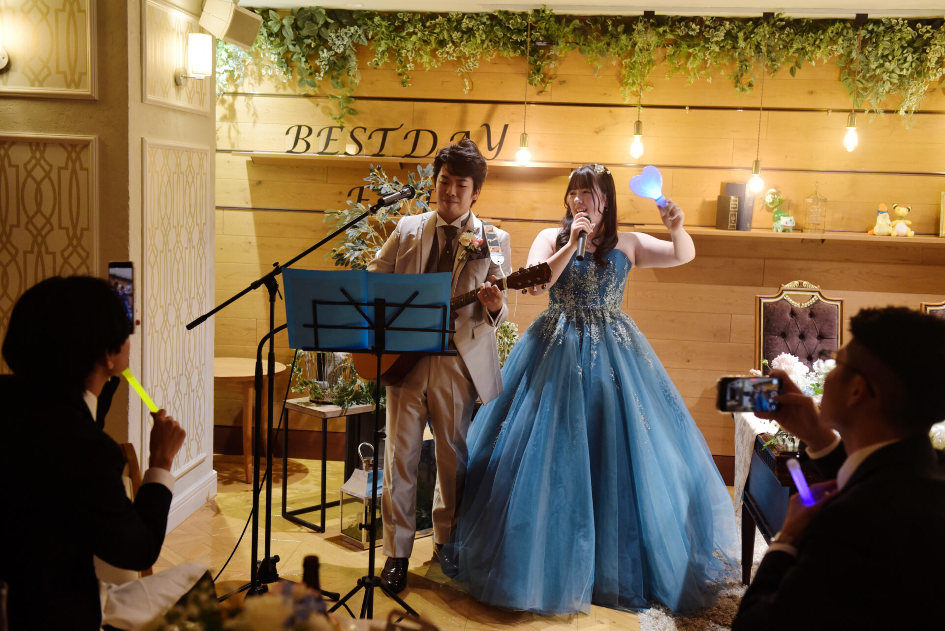 最後は【ライブ演出】。お色直し後の再入場ではペンライトを使ったドレス色当てクイズを行い、そのままライブ風の演出へ。曲はスピッツの「チェリー」。新郎が新婦へ告白したときに流れていた、大切な思い出の一曲です。会場がライトダウンするとペンライトの光が一面に広がり、ゲストの皆様と一緒に歌声が重なる瞬間は、胸が熱くなるほど幸せで感動的でした!
