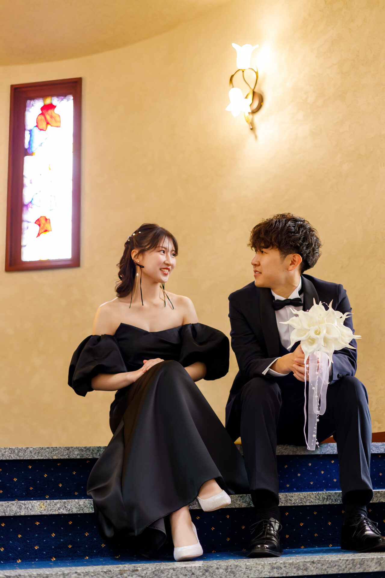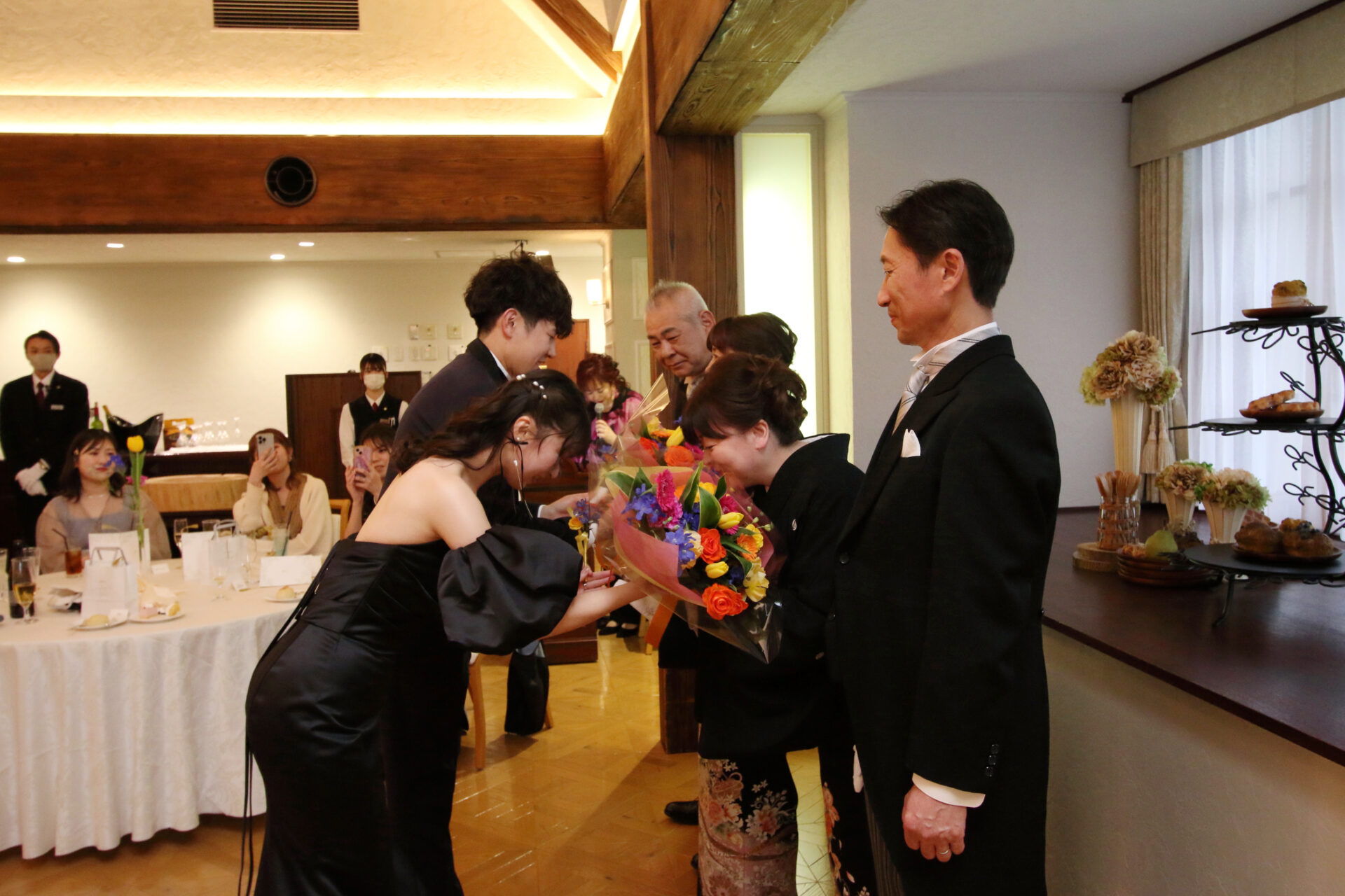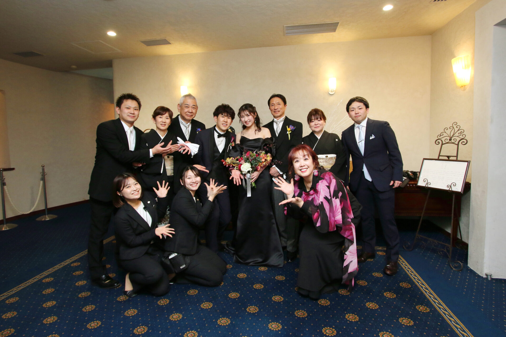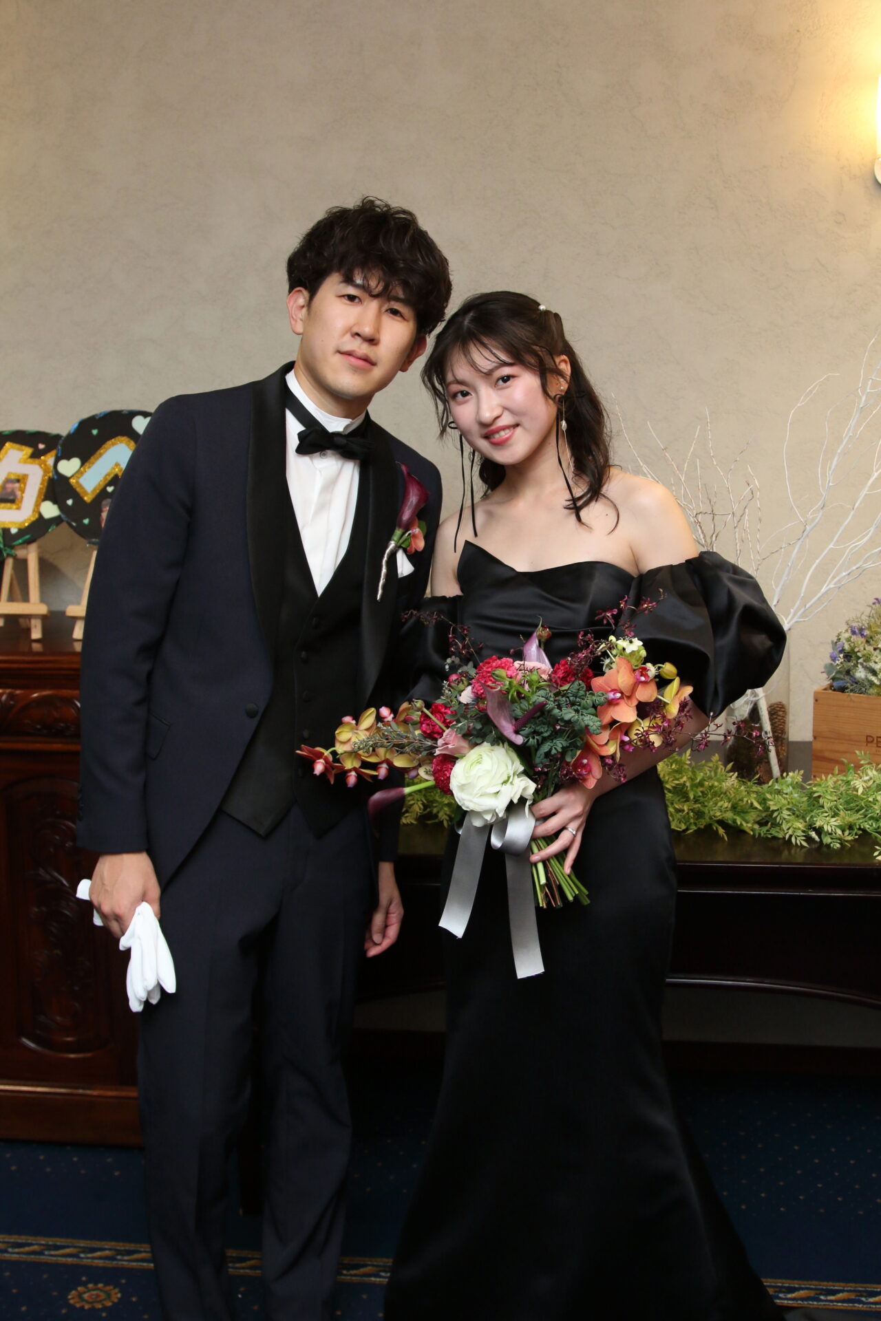 新婦の黒色ドレスは普段あまり見ることのないレアなカラーで、会場でも「珍しい!」「大人っぽくてすごく綺麗」と大好評でした。